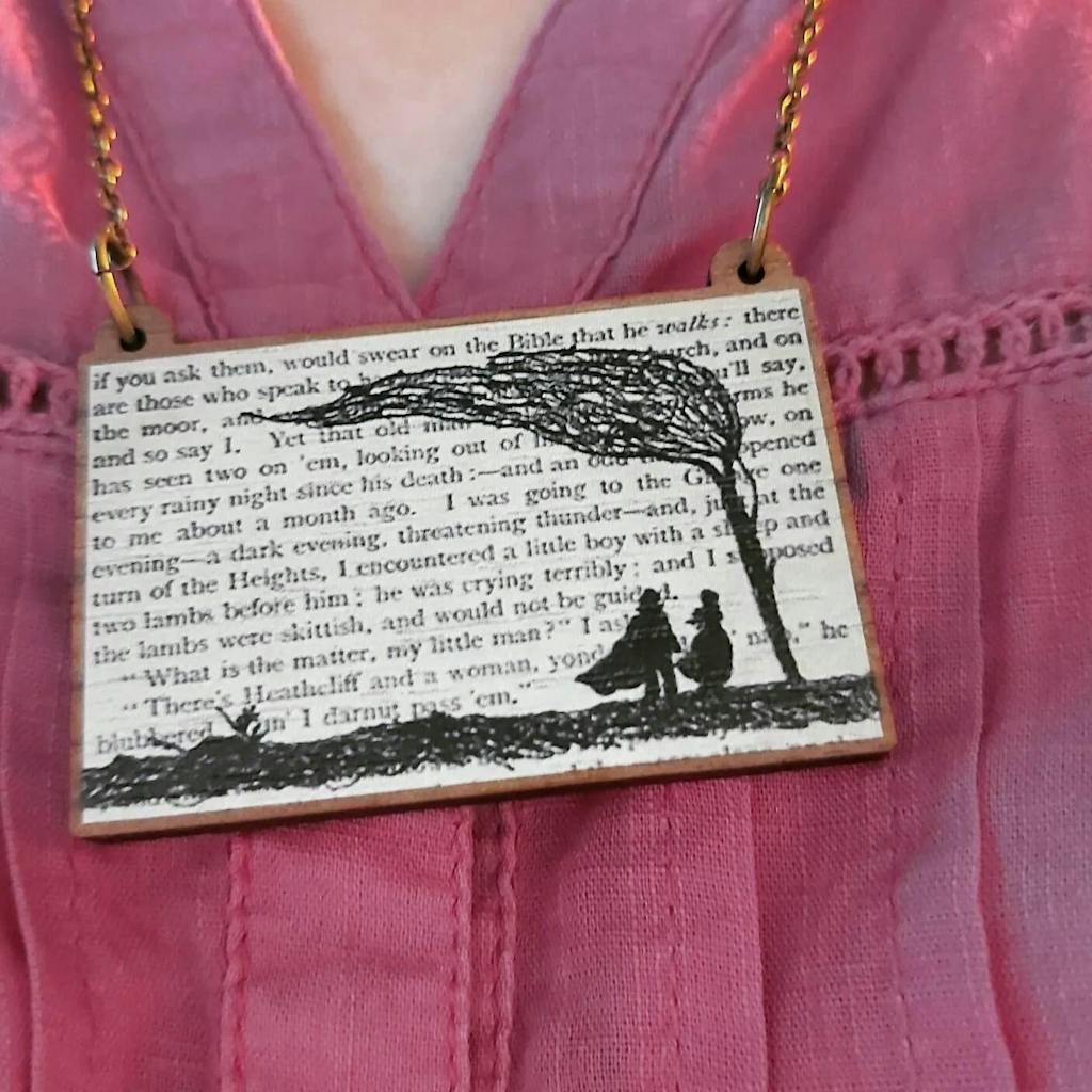 Those of a bookish disposition I may have just the thing for you! Wear your favourite scenes from classic literature with this eco friendly wooden necklace, inspired by Emily Brontë's Wuthering Heights, a perfect addition to any book lovers jewellery collection. The image on the necklace shows the silhouettes of Heathcliff and Cathy standing under a windswept tree on the moor with the original text of the book behind them.