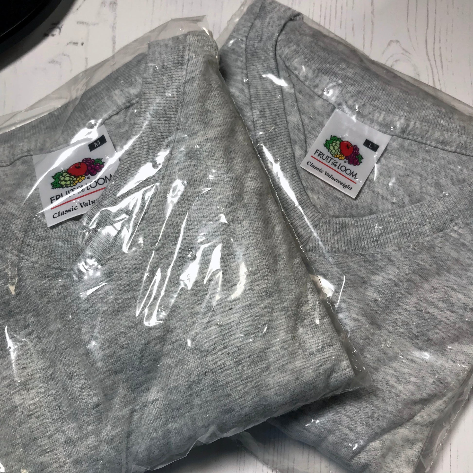 Two Fruit of the Loom (Classic Value weight) T-shirts in grey.